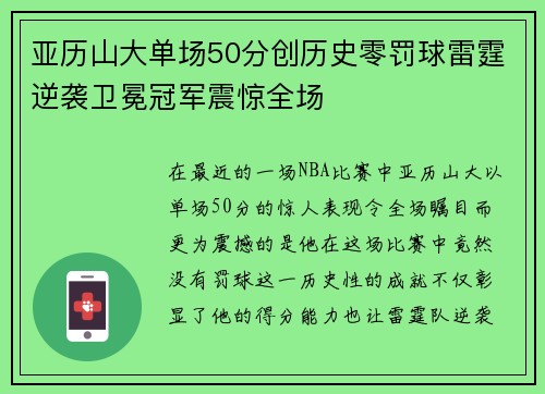 亚历山大单场50分创历史零罚球雷霆逆袭卫冕冠军震惊全场